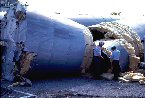 Figure 1: This image shows the collapse of two 316L Stainless steel storage tanks containing 65% phosphoric acid.These tanks had survived for many years without losing integrity. Due to a loss of cooling capacity in the phosphoric acid plant, the acid was pumped to the storage tanks at 70C, instead of the usual 50C.At the elevated temperature, chlorides present in the phosphoric acid caused stress corrosion cracking in the heat affected zone of the welds where high residual stresses were present.